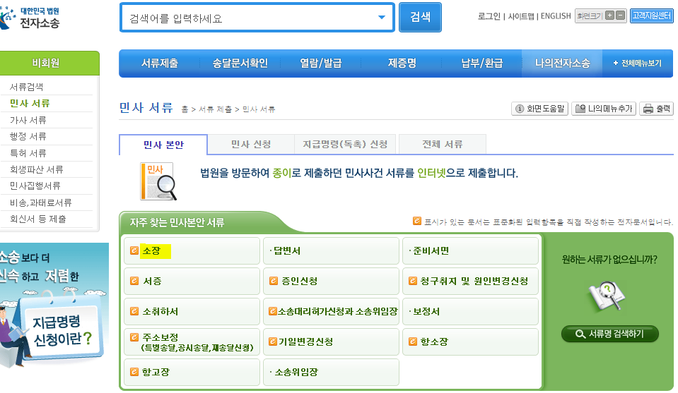 전자소송 홈페이지엥서 서류제출 -> 지급명령 -> 지급명령신청서로 이동한다.
