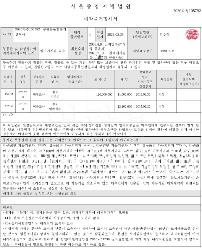 법원에서 정리한 최종 문서이기 때문에 세가지 문서 중에서는 제일 중요한 문서라고 볼 수 있다. 이번 글에서는 간략하게 매각물건명세서에 나와있는 사항에 대해 알아보도록 하겠다.