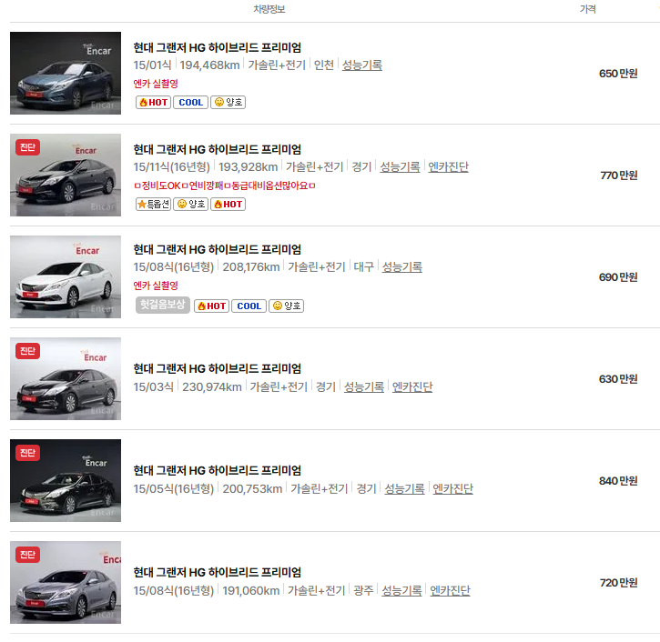 단순하게 검색을 하자면 8번 항목의 그랜져를 예를 들겠다. 물론 번호판으로 조회해서 해당 차량의 옵션과 등록부원부등을 조회해야 히스토리를 자세히 알 수 있겠지만, 그 방법은 여기서는 거론 하지 않는다. 전자책이나 검색을 하면 자세히 나올 것이다.