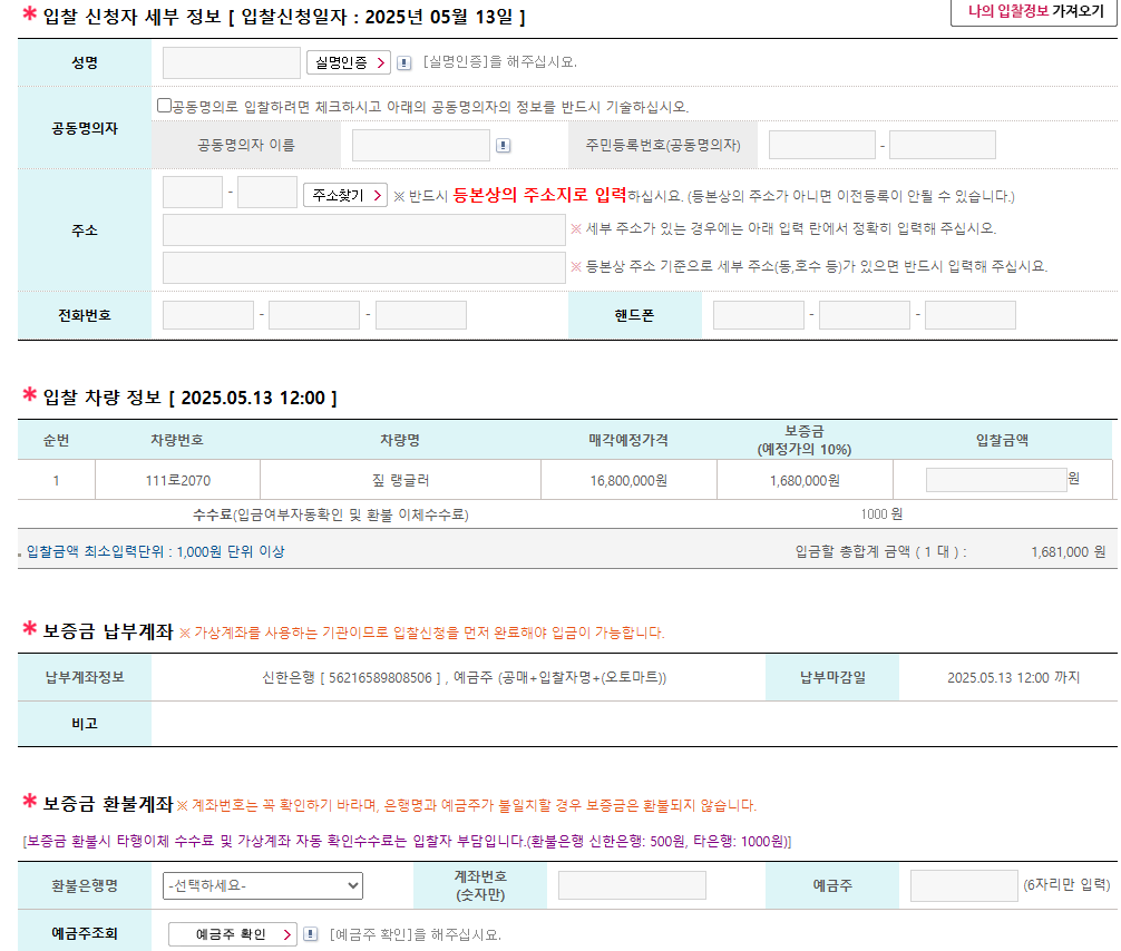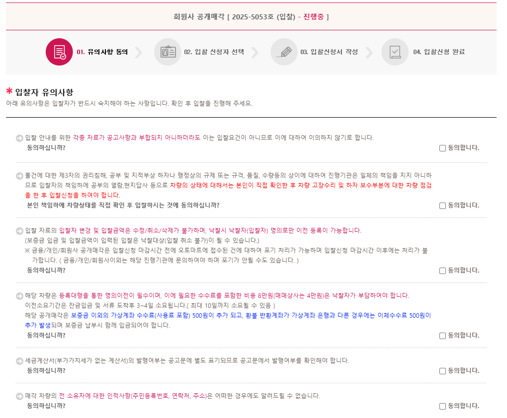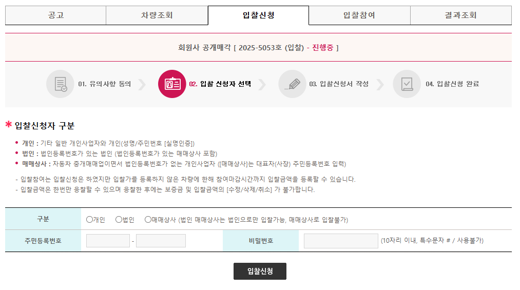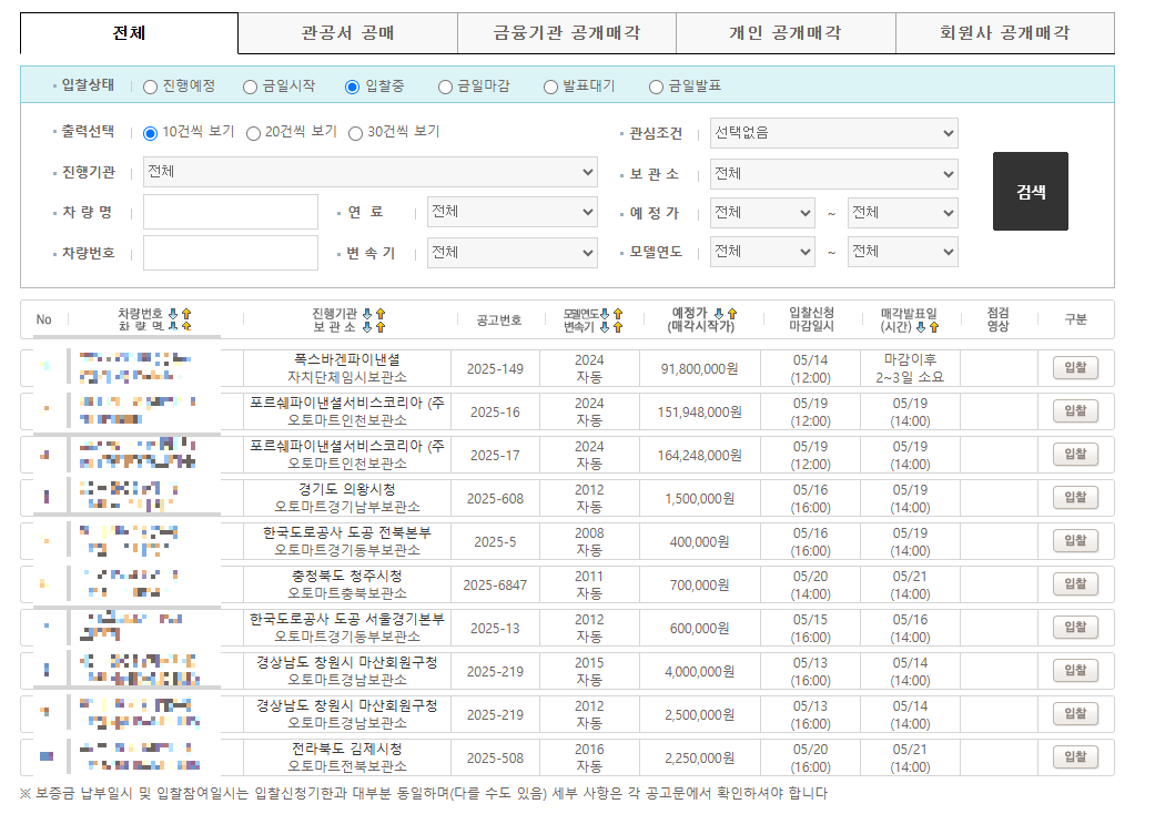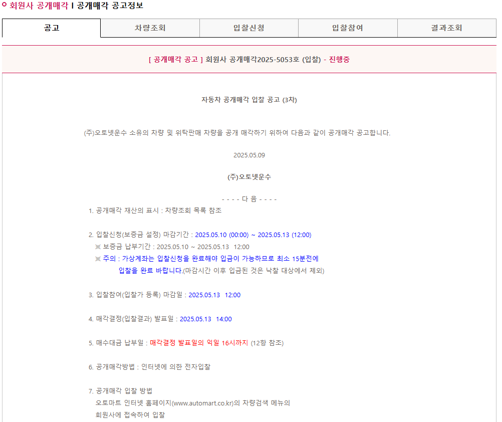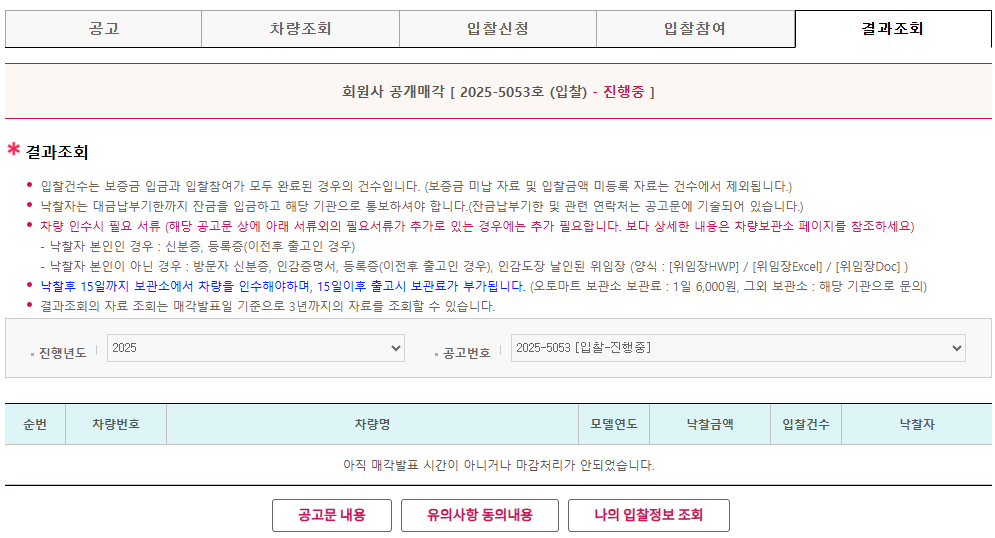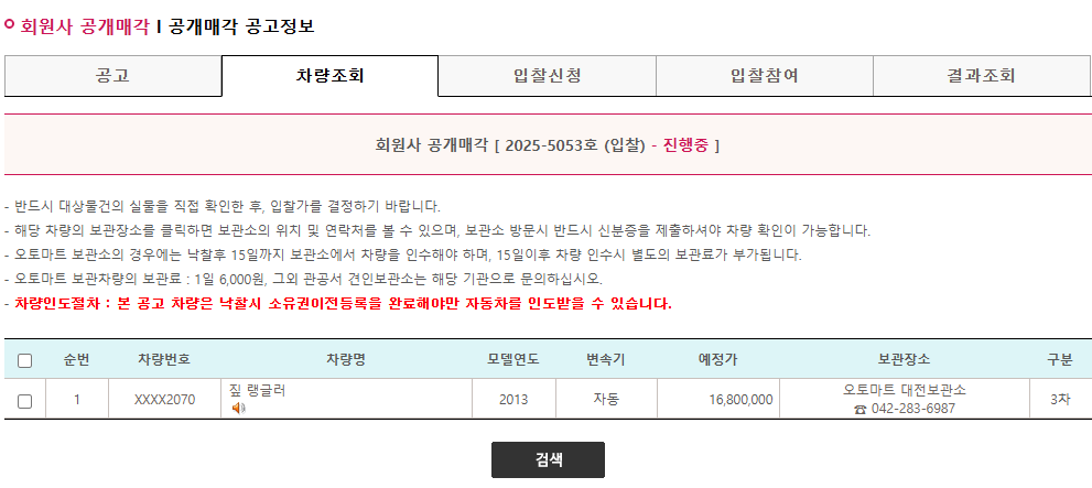 위의 방법으로 입찰해야할 차량이 정해 졌다면 입찰을 한다. 입찰 버튼을 누루면 공고 내용과 해당 공고의 차량들 신청 참여 등이 나오게 된다 .