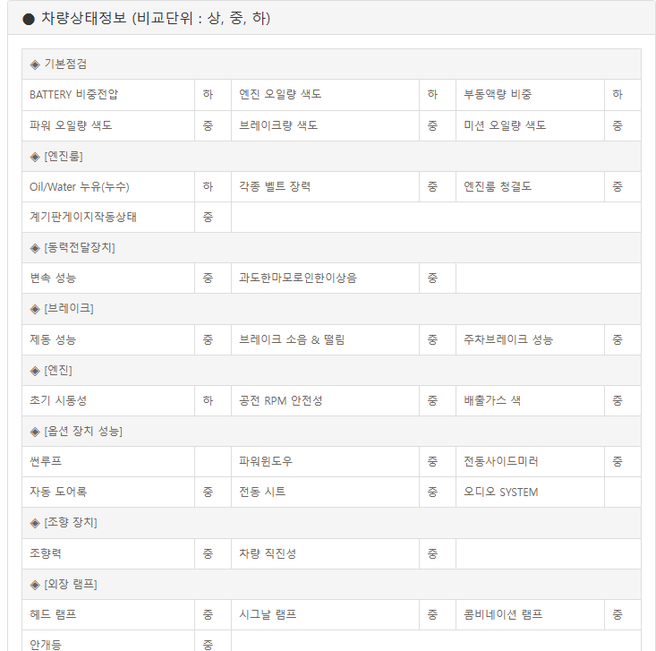 차량점검서를 보자 차량 점검서에는 해당 차량의 연식 주행거리 옵션등이 표기 되어 있다. 하지만 실제 옵션이 누락되어 있는 경우도 있고 추가 옵션등이 있는 경우도 있어서 이부분은 차대번호로 조회하거나 임장을 가서 확인 해야 한다.