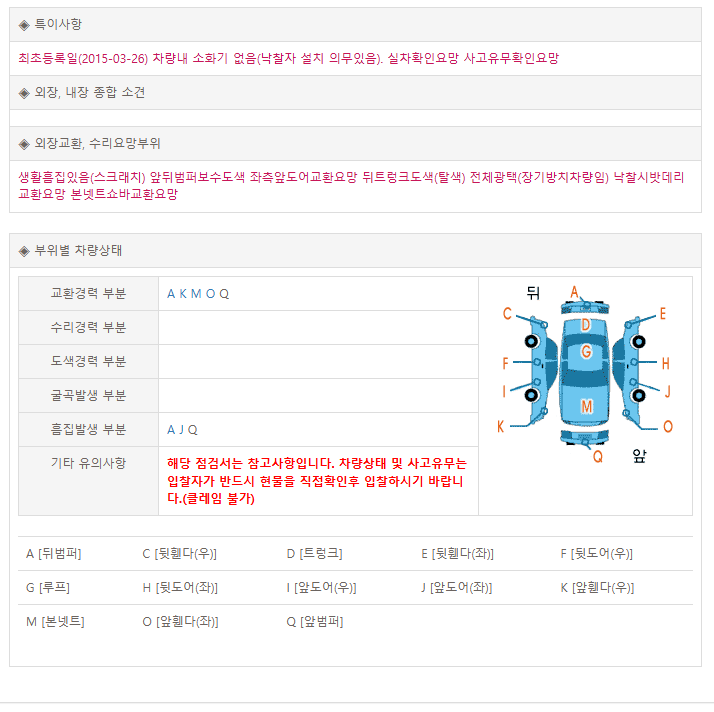 대략적인 금액만 봐도 적정가는 평균 600~700정도 이다. 현재 이차량의 예정가는 400만원이다. 거기에 명시되어 있는 외판 2판 작업 포함 광택 100만원 , 경정비 오일은 기본으로 잡고 10정도 거기에 타이어 상태 60정도(인터넷 가) 타이밍 벨트 교체 유무에 따라 입찰할 가격이 적당한지가 나온다. 이차량의 경우 임장을 해봐야 더 정확하겠지만 보여지는 것만해도 최소 2백정도인데 그럼 결코 400이란 금액이 싼 입찰가가 아니라는 판단을 할 수 있다. 팁을 주자면 10만 이상된 차량들은 기본적으로 타이밍 벨트 교환(워터펌프) , 하체 정비 , 디스크 , 패드는 기본적으로 되어 있어야 금액을 줄일 수 있다. 타이어와 외관스크래치등은 큰 돈이 들지 않는다.