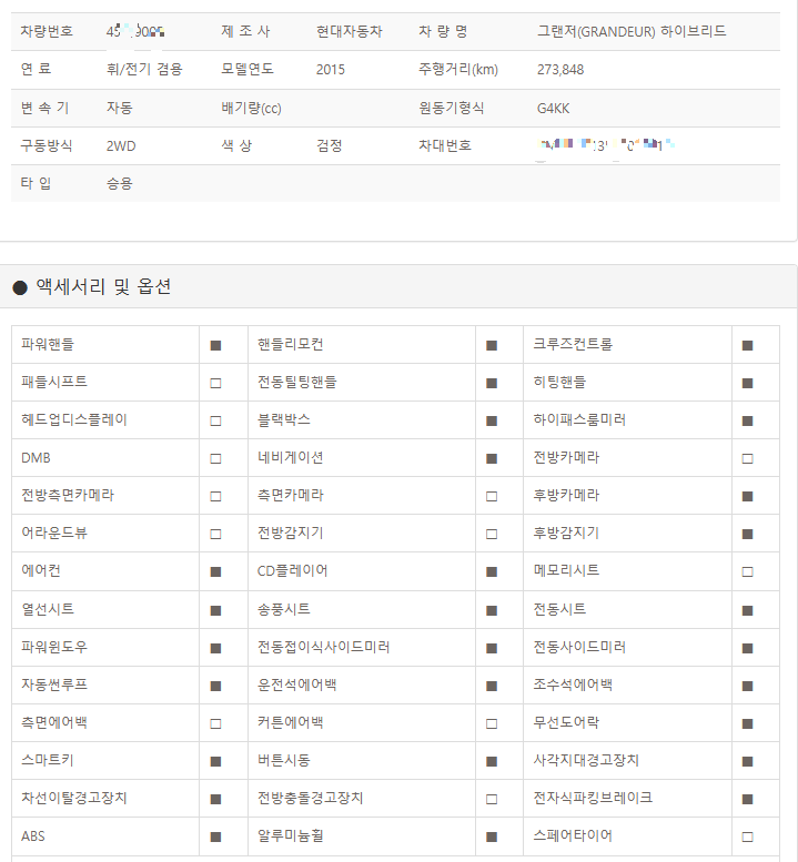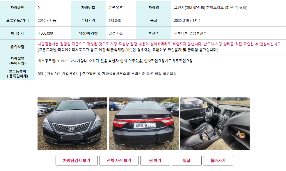 위 차량은 2015년식 그랜져 HG 하이브리드 차량으로 주행거리 27만의 장기 방치 차량이고 부분 교환 차량이라고 명시 되어 있다.