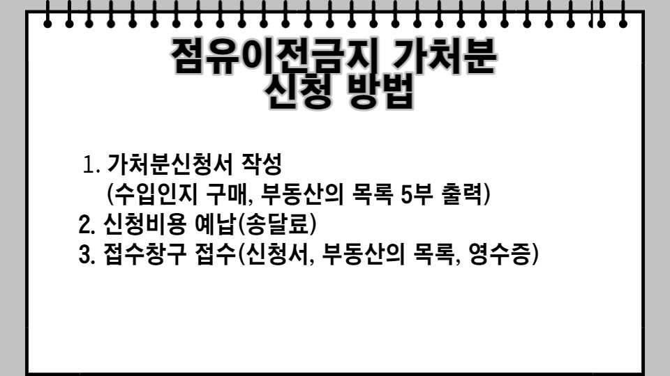 신청 취지와 신청 이유를 적어야 한다. 여기서 신청취지란 권리보전을 위한 내용을 적어야 한다. 가처분을 통해 구하려는 그 내용을 말하며, 권리를 보전하기 위해 필요한 내용을 적는다(예시참고). 신청이유는 신청취지를 구하는 근거로서 피보전관리의 존재 즉 본인의 자격에 대한 소명, 낙찰자 및 소유권자임을 적시하고 보전의 필요성을 적어야 한다. 여기서 보전의 필요성은 점유자(채무자)의 점유 사실과 이전할 경우의 문제 소지에 대한 내용을 적는다(예시참고). 신청서를 작성하고 인도명령 제도와 마찬가지로 부동산 목록, 등기부등본과 과세대장등본(목적물가액 산출 근거자료)를 첨부한다. 그리고 수입인지(1000원)를 구입해 신청서에 부착하고, 송달료 예납 영수증(3회에 해당)과 함께 신청 접수 하면 신청 절차는 끝이 난다.