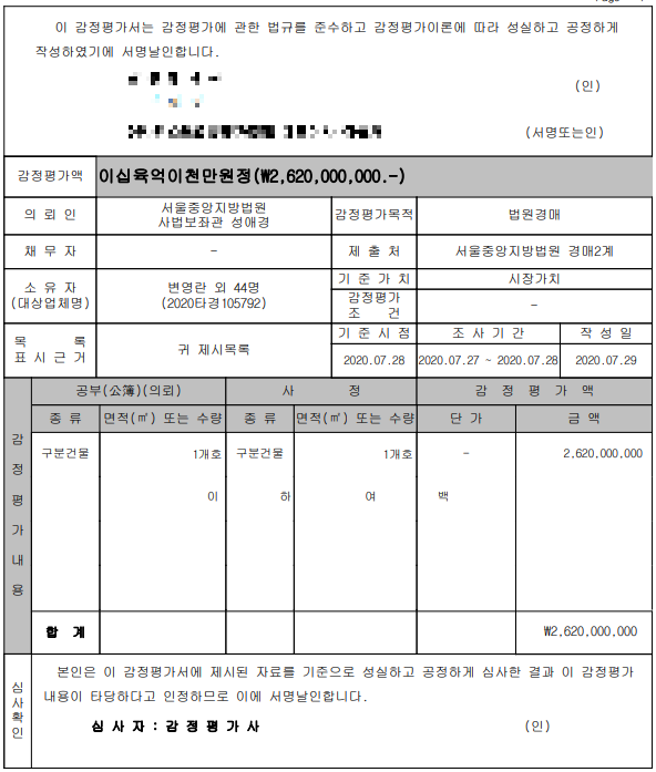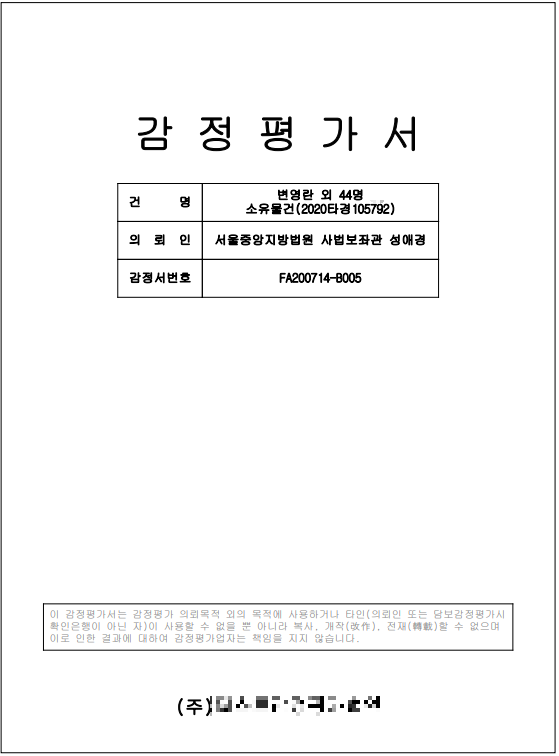 감정평가서에서는 최소한 감정평가 일자만이라도 확인해야한다. 감정평가서는 첫 장에 사건번호와 의뢰인(집행관)등이 적혀있다.