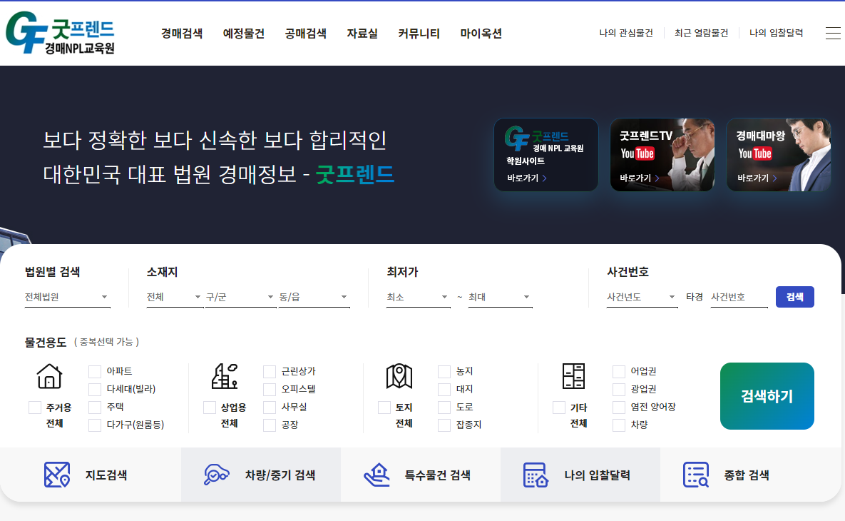 경매 사이트들은 기본적으로 유료 사이트를 이용하는 것이 좋다. 전국 단위로 이용하기에는 금액이 비싸다. 백만 원 돈을 들여서 그만큼의 많은 물건들을 접하고 하는 것도 공부라면 공부겠지만, 무료 사이트로 시작해서 물건을 보고 부족한 부분이 있다면, 경매 학원에서 경매강의를 듣고 무료 이용권으로 경매사이트를 이용하는 것을 추천한다. 충분히 수준이 올라간 다음에 유료 경매사이트를 이용하기를 추천한다. 검색은 본인 지역 근처에서 시작해서 점점 이동 가능한 수준으로 넘어간다. 적은 돈의 물건을 입찰해서 낙찰까지 한 사이클을 돌려보는 것도 좋은 방법이다. 이번 글은 경매 정보를 볼 수 있는 사이트를 몇 가지 적는 짧은 글이었지만 비교글은 일부러 하지 않는다. 홈페이지 이미지 중 마음에 드는 것으로 선택해서 이용하면 된다. 유료 사이트는 보통 무료 이용권을 제공한다. 나중에 법원 경매를 통한 투자 물건이 늘어나게 되면 이용권을 이용해서 사이트들을 이용해 보고 동일 물건 대비 제일 이용하기 편한 사이트를 추후 구매하면 된다.