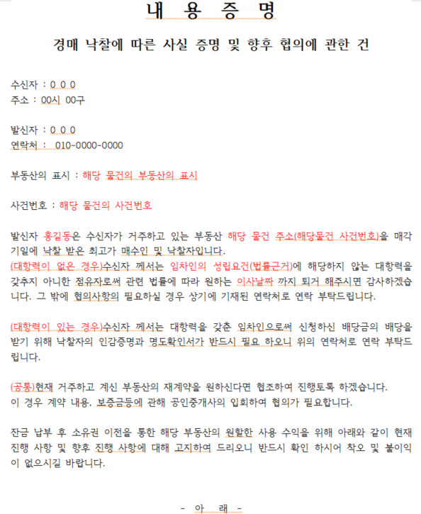 내용에는 해당 부동산의 내용, 사건번호 낙찰에 따른 내용 공유, 현재 거주자의 사항 퇴거해야하는 법률근거 등을 적는다. 그 아래에는 원하는 부분을 정하면 된다. 이사시기등에 대한 내용과 시기 준수시 비용지원 등에 대한 내용, 명도절차에 대한 내용 지켜지지 않을 경우 인도명령 강제 집행의 절차 부당이득금의 청구 같은 것들이다. 아래 부분에 불이익에 대한 사항이나 법적 절차를 적는 것이 좋다. 아래의 예시를 참고만 한다. 빨간색 부분은 해당 물건에 따라 바꾼다.