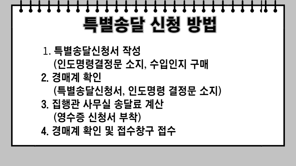 특별송달은 우편물을 집행관이 직접 송달하는 것을 말하며, 가능한 시간대를 참작하여 주간, 야간 및 공휴일 특별송달 중 택해야 한다. 인도명령 결정문이 나오고 나서 신청 가능하며, 마찬가지로 수입인지를 사서 특별송달신청서에 부착해야 한다. 또한 집행관의 수수료도 지급해야 한다. 순서는 아래와 같다.